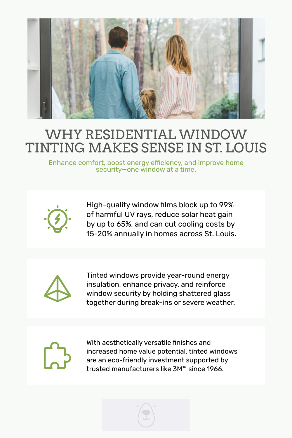 St. Louis experiences a range of weather conditions, from hot, humid summers to cold, snowy winters. The versatility of window tinting comes into play by offering year-round benefits. During summer, our window films help keep your home cool and comfortable by blocking excessive heat and glare. In winter, they help retain indoor heat, providing an extra layer of insulation to your windows. This dual action makes window tinting an excellent choice for energy conservation, which is becoming increasingly important given the rising energy costs in metropolitan areas.